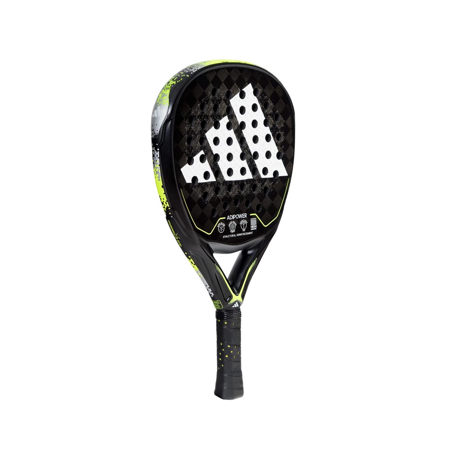 The Adipower 3.2 with its diamond shape is the strongest racket in the Adidas collection. It is designed to get the best out of power shots. It is a racket with excellent manoeuvrability thanks to the weight, geometry and materials used, optimal comfort on all shots and unlimited power thanks to the aluminised carbon fibre surface and the high memory EVA rubber.